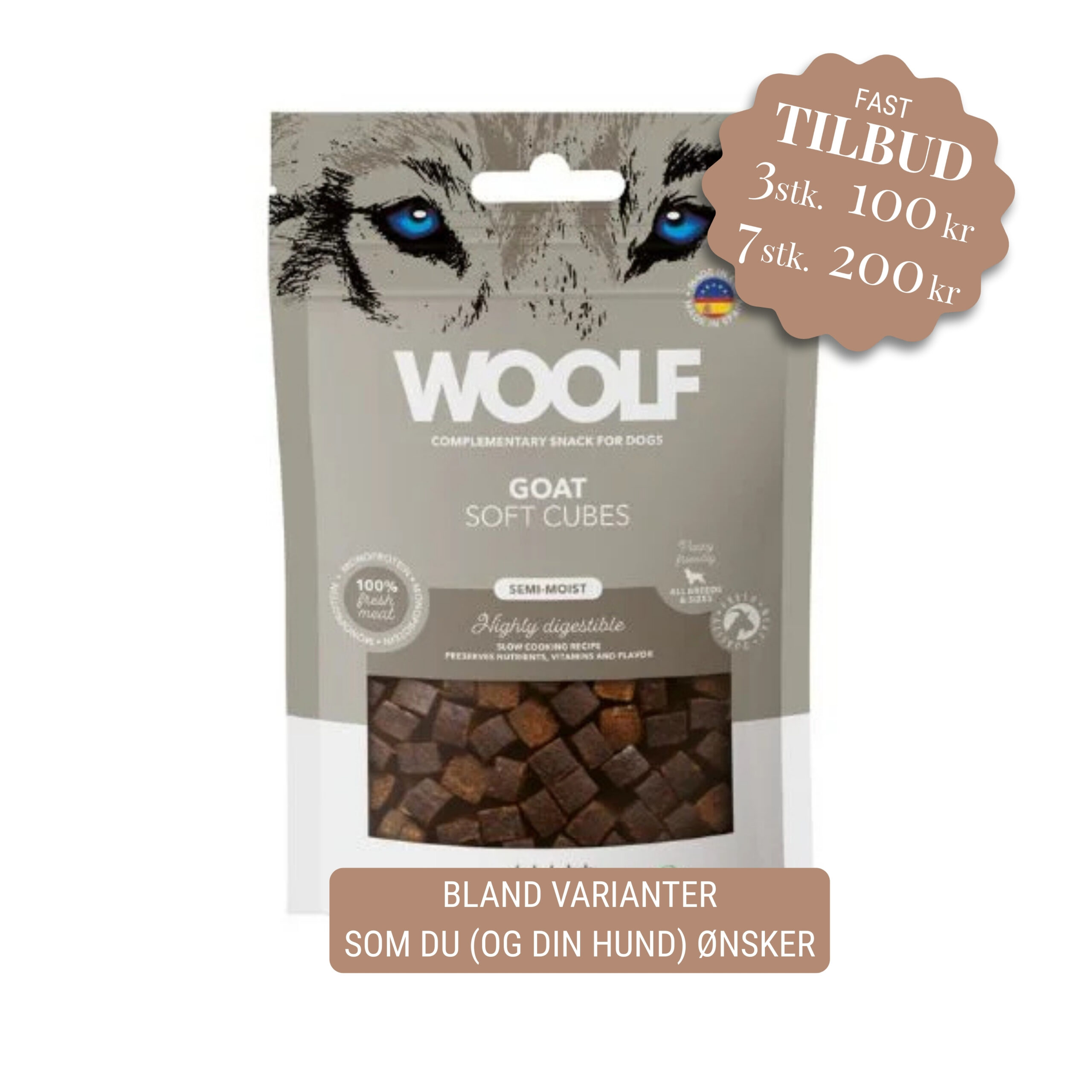 KØB 3 POSER FOR 100,00 KØB 7 POSER FOR 200,00 Mix imellem alle WOLF varianterne KØB Woolf Soft Cubes er en blød og smagfuld godbid velegnet til træning, belønning, til store til små og til hvalpe.
