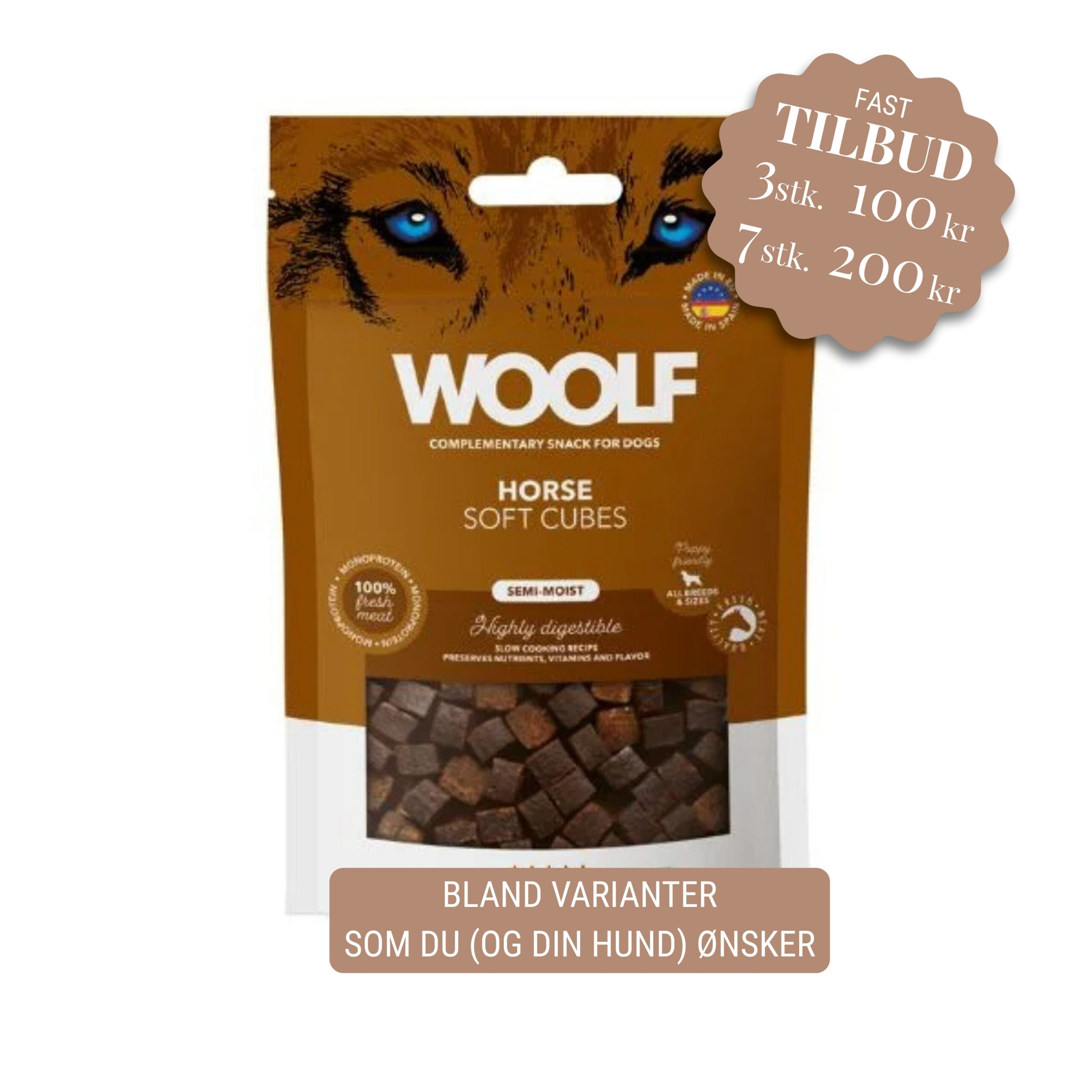 KØB 3 POSER FOR 100,00 KØB 7 POSER FOR 200,00 Mix imellem alle WOLF varianterne KØB Woolf Soft Cubes er en blød og smagfuld godbid velegnet til træning, belønning, til store til små og til hvalpe.